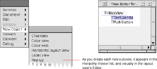 - With the Hierarchy Viewer active for the layout view, use the New Object menu to add user interface elements to the layout view. You can create grids by adding perpendicular layout views as subviews.