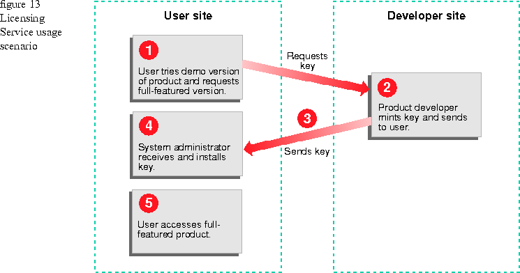 In a typical scenario, a user would have access to a demonstration version of a licensed product distributed by the product's developer. The user, if interested in the full-featured version of the product, orders the product from the product developer, and provides any required configuration and customer information. The developer creates an activation key and sends it to the user. The user (usually a system administrator) then installs the key to provide access to the full-featured product. An overview of the Licensing Service usage scenario is shown in Figure 13.