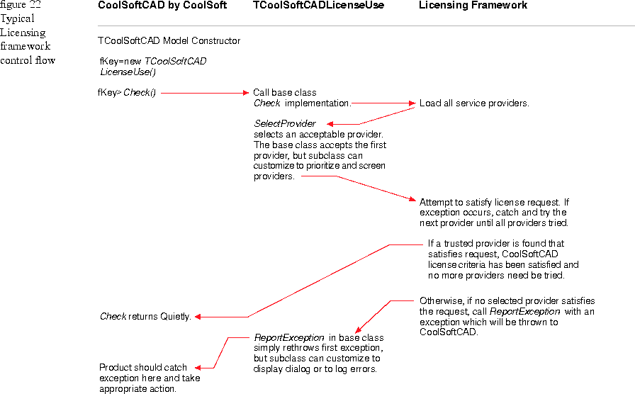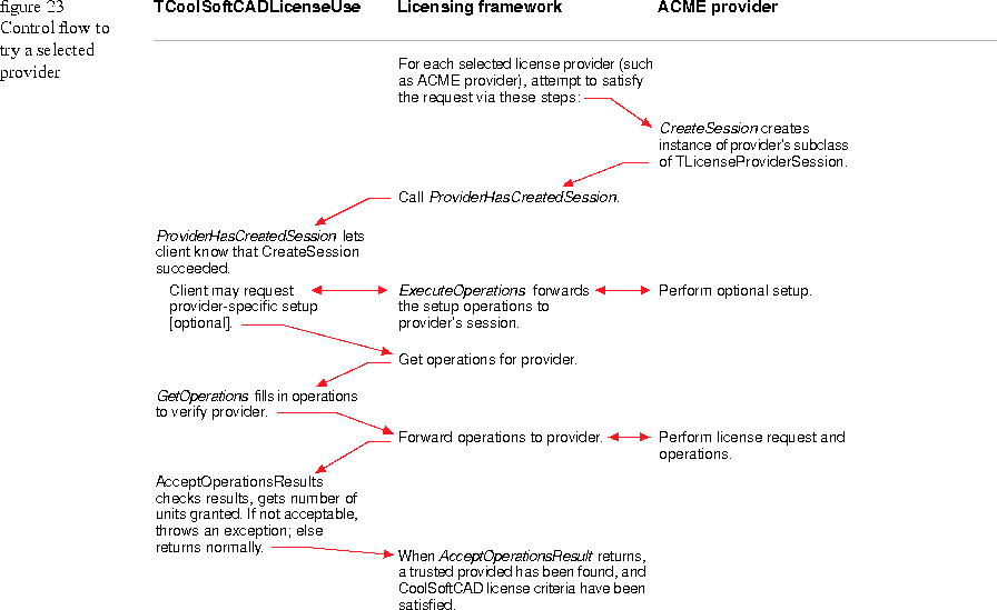 The attempt to satisfy the license request against each of the selected license providers requires communication among the licensed product, the Licensing framework and the license provider currently being tried. Figure 23 depicts the typical flow of control as a single selected provider is tried. In this diagram, CoolSoftCAD is the product to be licensed, TCoolSoftCADLicenseUse is derived from the TLicenseUse base class, and the ACME LicenseServer is used as the license provider.
