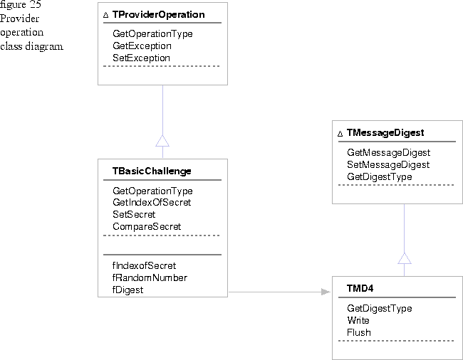 The Licensing framework provides default provider operations, or protocols. Licensing server providers can use these default provider options intact, or as a model for their own implementations. The most powerful of these, shown in Figure 25, is a challenge protocol based upon the MD4 message digest algorithm, and implemented in the class TBasicChallenge.