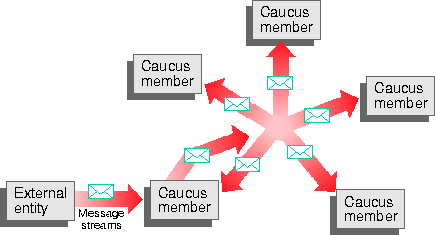 Caucuses are closed communication groups; an entity that is not a caucus member cannot communicate with the caucus using the caucus interface. Instead, outside entities need to use another communications channel--such as Message Streams--to communicate directly with one of the caucus members. The caucus member that receives this message can then use the caucus interface to send a message to the caucus on behalf of the outside entity.