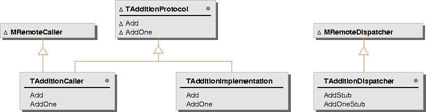 - Derive a caller class from the abstract base class, mixing in MRemoteCaller, and supplying a stub for each member function you want the dispatcher to execute.