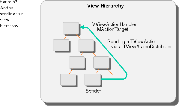 shows how a parent view can receive an action message from a child view by mixing in the MViewActionHandler and MActionTarget classes. The sender sends a TViewAction using a TViewActionDistributor. View actions contain a standard text string for the message.