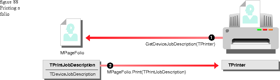In the simplest case, when you want to print a set of pages you pass Printing services a folio that represents the set of pages and a print job description that contains a device job description from the target printer. This printing process is illustrated in Figure 88.