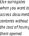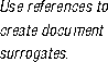 TDocumentReference provides a lightweight document handle that persists after document closure. It is much less expensive in computational terms to keep a reference to a document than to keep the document open. A document reference provides a means to run and access a document after its creation and closure. Because the document reference is unique, you can create a TDocumentSurrogate and manipulate a given document directly. Derive a subclass from the surrogate to provide access to content-specific data.