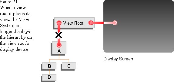 When the view root orphans the view (or when the view root itself is deleted), the view and any hierarchy under it disappear from the display device. Figure 20 and Figure 21