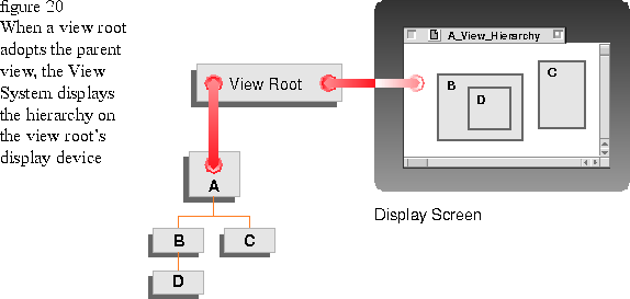 When a view root adopts a view, it becomes the owner of the view and any view hierarchy under it. The adopted view hierarchy appears on the display device associated with the view root. (This is a simplified explanation. Actually, the adopted view is initially marked "invalid" and the View System eventually requests that it refresh itself. See "Drawing by invalidation" on page 83 for details.)