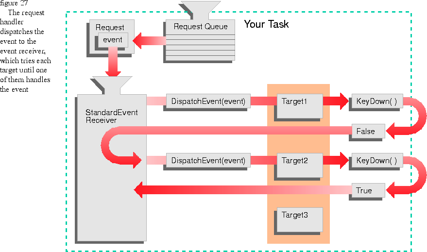 illustrates that, within each target, DispatchEvent calls the target's KeyDown member function. By convention, if the target's KeyDown member function returns True, the event receiver considers the event handled and returns. Otherwise, the event receiver calls the next target's KeyDown member function.