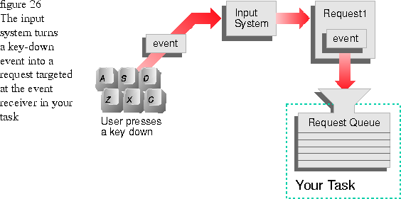 illustrates how the input system converts an key-down event into a request for your task's event receiver.