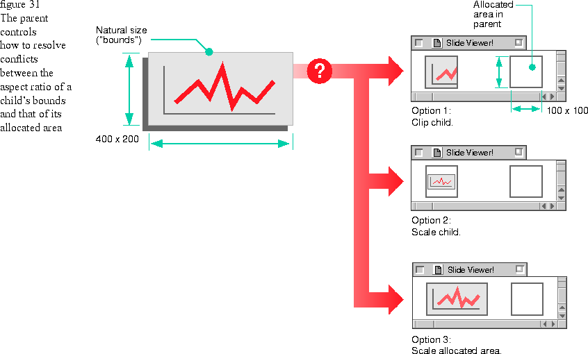 However, suppose you want to display an image whose bounds are not square, such as the line graph shown in Figure 31. Because the allocated area in this example is a fixed square, it is not possible to retain the aspect ratio of the child when rendering the child in the allocated area. The parent needs a layout policy to determine how to resolve the conflict between bounds and allocated area.