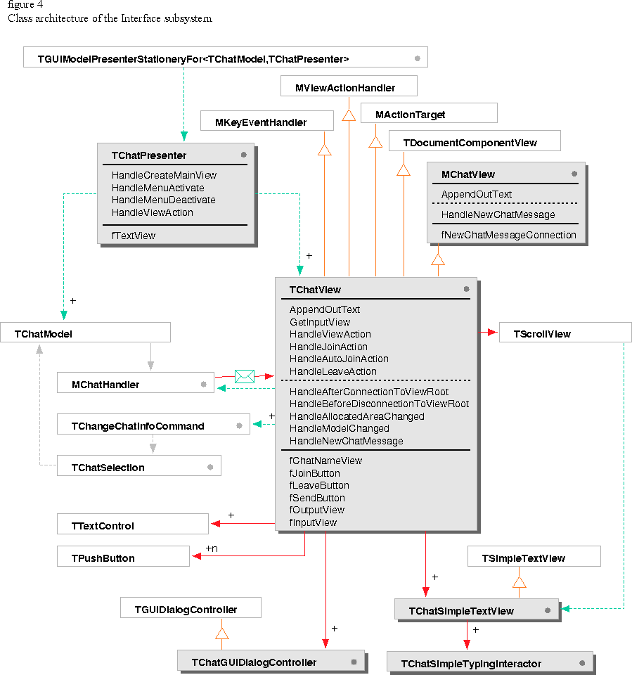 TChatView is a concrete MChatView. It is the main view created in the program. It creates all the subviews that present the visual aspect of the sample. This view is retrieved from an archive created by Taligent's UI Builder. In addition, TChatView inherits from a mixin class (MKeyEventHandler) which overrides TChatView::KeyDown to catch the enter key and simulate the Send. TChatView defines a connection for receiving text from MChatHandler. When it receives the notification, it updates it's text in this program's window pane and refreshes the view.