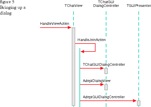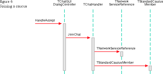 When the user clicks on the Join button in the dialog, this program calls the TChatGUIDialogController::HandleAccept which attempts to join the specified caucus. If the caucus does not exist, the Caucus framework attempts to create it before adding a new member. The object interactions in the next figure illustrate a caucus that is successfully created and joined by a user.
