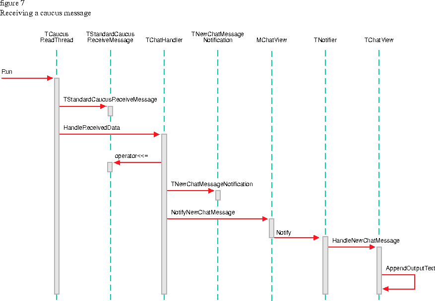 When the caucus is up and running, a TCaucusReadThread object runs in a separate thread, awaiting incoming caucus messages. When it receives a message, it calls the appropriate message handler routine. This routine is passed in as an argument when TCaucusReadThread is constructed.