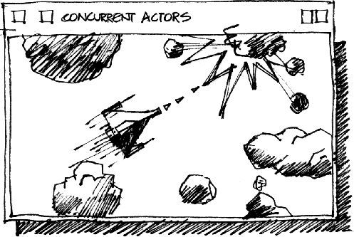To end users, Concurrent Actors is a simple simulation. It presents a bounded universe in which you control an armed spaceship, playfully blasting asteroids. Underlying the game behavior is a versatile graphic simulation architecture.