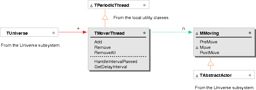 The TMoverThread class implements a thread that periodically moves objects in the simulation. There is a single instance of TMoverThread owned by the TUniverse object. The MMoving class defines an abstract protocol for use by instances of the TMoverThread class.