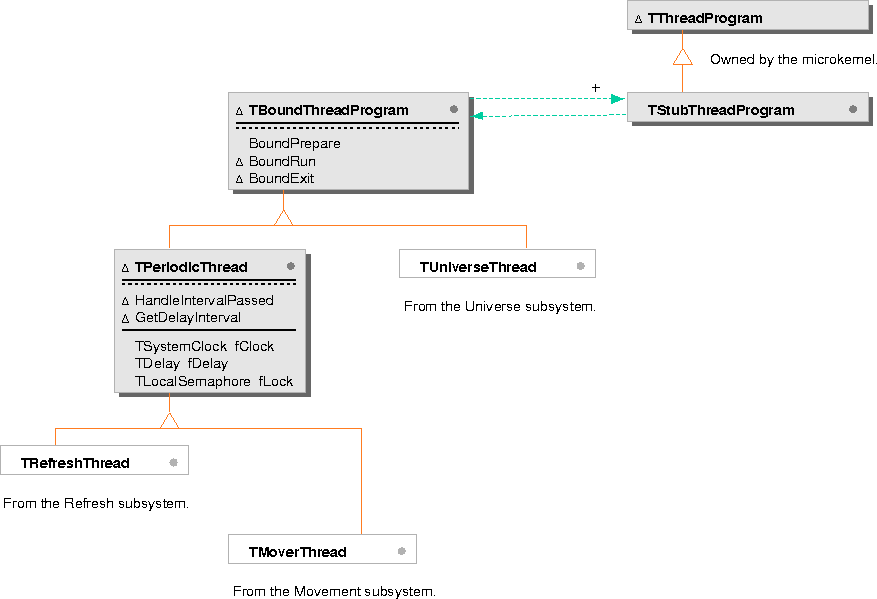 The thread classes are used by the Movement, Refresh, and Universe subsystems. TPeriodicThread is the base class for the time-based movement and refresh threads. TStubThreadProgram and TBoundThreadProgram separate the protocol of the thread object from the thread state.