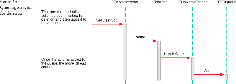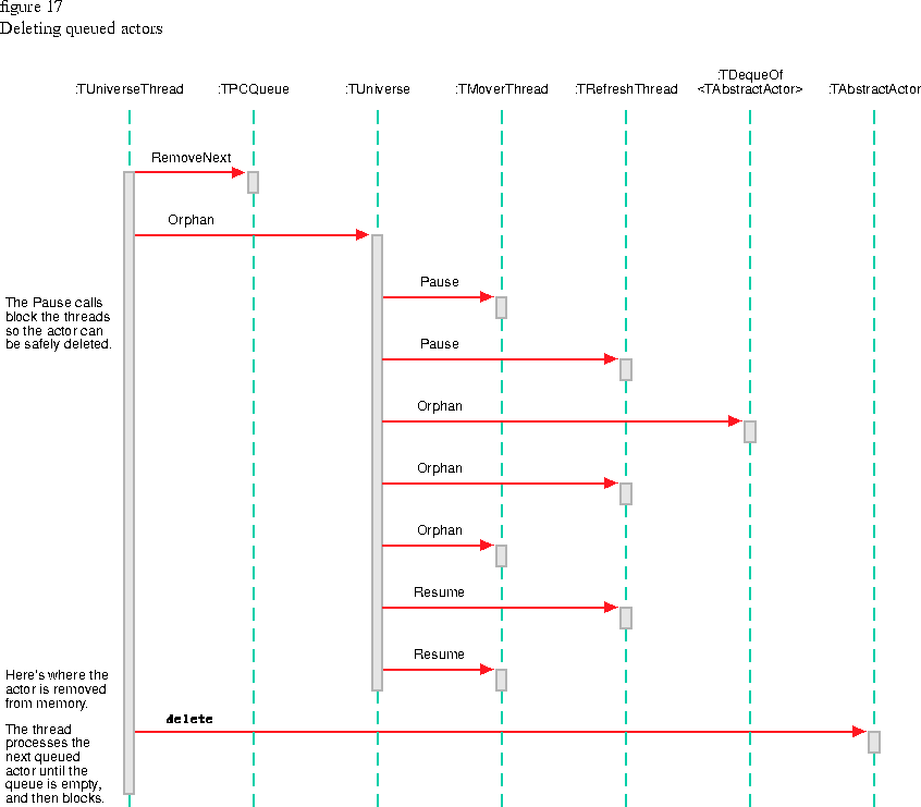 Once the universe thread has locks on the mover and the refresh threads, it can safely delete the queued actor, knowing that actor isn't being used by the other threads. The mover and refresh threads can only reacquire their locks--and resume executing--after the universe thread sends resume calls. void