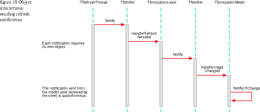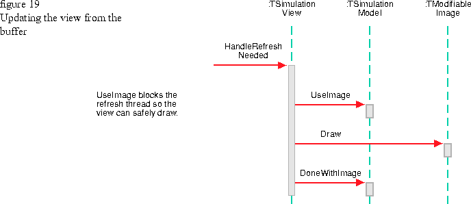 When the view receives the refresh notification, it draws the buffer to the screen. To guarantee that the image doesn't change before the draw operation can complete, the view lets the model know when it wants to draw and when it has finished drawing. The model blocks the refresh thread appropriately.