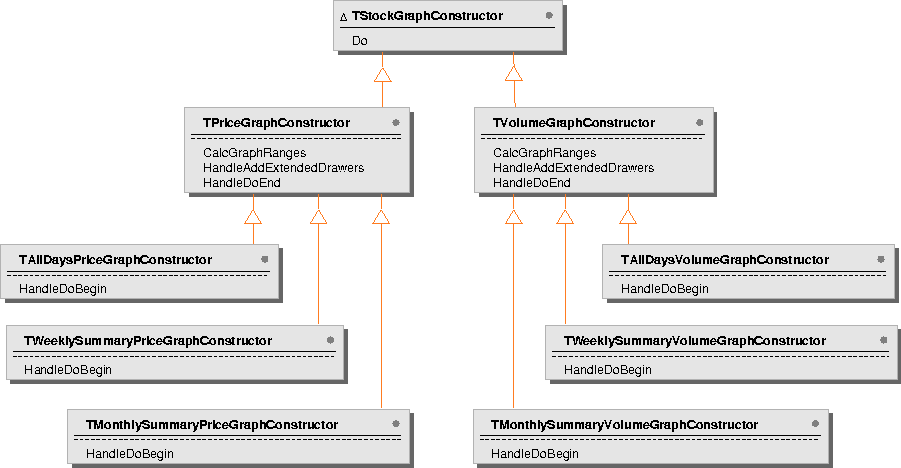 TStockGraphConstructor is an abstract class which provides protocol for setting up a TStandardGraph with the right drawer objects. The concrete classes derived from TStockGraphConstructor parse the stock data and set up drawers that are appropriate to the type of graph being displayed.
