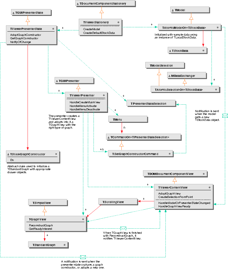 TGraphView owns a TStandardGraph object. When TViewerContentView receives notification of new stock data (which occurs when the stock data in the model changes) or a new graph constructor is selected by the user, it calls upon its TGraphView object to reconstruct its graph and then TViewerContentView calls Invalidate. This causes the view system to call TViewerContentView's and TGraphView's DrawContents function which redraws the graph and updates damaged or invalidated areas of the view.