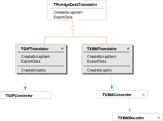 CreateScrapItem provides the interface for converting an abstract TForeignData object to a CommonPoint TScrapItem. Both sample translators achieve this by creating a stream from the TForeignData object and then parsing the incoming data. TGIFTranslator accomplishes this by using the built-in CommonPoint TGIFConverter. TXBMTranslator shows a full conversion from an incoming data stream to an X-Bitmap image.