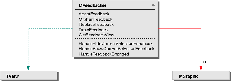 The MFeedbacker class defines a protocol and provides an implementation for feedback management. Although it's seldom needed, derived classes are free to override parts of the implementation. The interface is cleanly divided into an external client (caller) portion and a portion of interest to derived classes (the protected functions). MFeedbacker keeps a reference to a view for use as a coordinate system for the exchange of graphic data, much like the MSelectionMapping class does.
