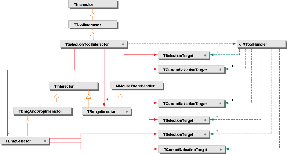 The behavior of the arrow tool is complex. It is often not possible to determine what the end result of a gesture will be from the first event. For example, when the user clicks on an item, it is not possible to determine if the gesture is a simple click-select or drag gesture until the next event is received. If the next event is a mouseup, then the gesture is a simple select gesture. If it is a mousemove, the gesture turns into a drag gesture. To make things even more difficult, keyboard modifier keys and the current selection also have a bearing on the outcome of a gesture. The TSelectionToolInteractor interprets events until it is able to definitively determine whether the gesture is a selection or drag gesture. Once this is established it begins a second, subordinate interactor, to complete