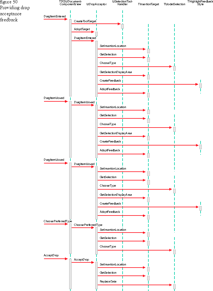 A user might drag an item and drop it in another location. For example, a user can drag a graphic off of the WebRunner Sample and drop it onto Taligent Chat's discussion window. When this occurs, the Drag and Drop framework provides feedback to indicate whether the drop is accepted. When a drop is accepted, ChoosePreferredType and AcceptDrop member functions display an insertion point.