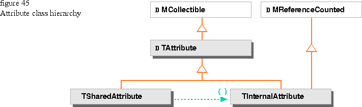This section discusses the internal and shared attribute classes. For attribute group classes, see "Attribute group classes" on page 159. Figure 45 illustrates the complete class hierarchy. Runtime relationships are presented throughout the remainder of this chapter.
