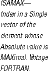 int ISAMax (int n, const float *sx) { int ixmax = -1; // if n <= 0, return -1 float_t sxmax = -1.0; if (n > 0) for (int i = 0; i < n; i++, sx++) if (Abs(*sx) > sxmax) { ixmax = i; sxmax = Abs(*sx); } return ixmax; }
