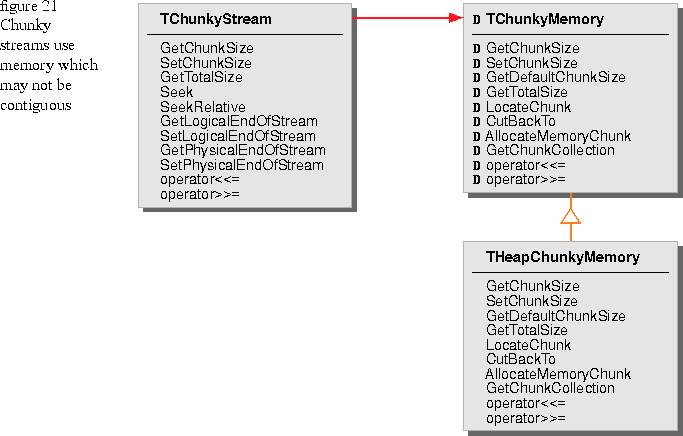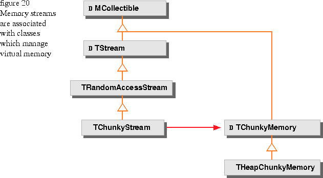 Associated with Memory streams are objects that are instantiated from a subclass of TChunkyMemory. This relationship is shown in the class hierarchy in