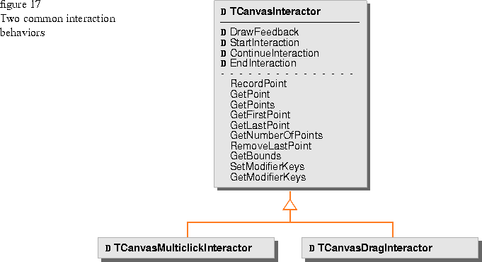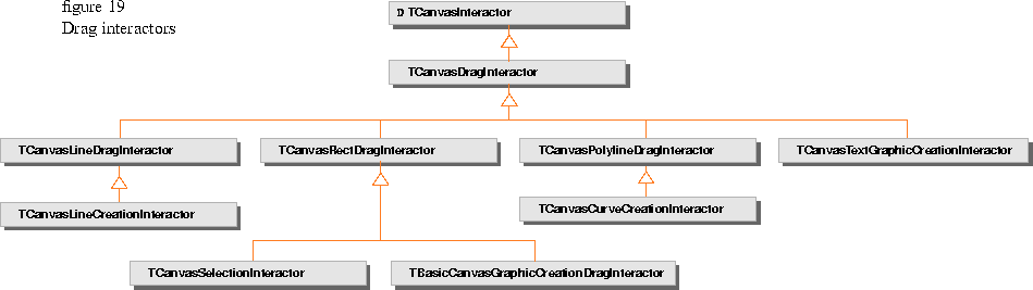 The TCanvasDragInteractor and derived classes (shown in Figure 19) feedback styles are described under "Interaction feedback" on page 90.