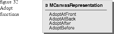 Figure 32 shows the functions for adopting canvas graphics. Clients of MCanvasRepresentation can adopt canvas graphics at the front (closest to the viewer), at the back, after, or before a designated graphic that is already in the representation.