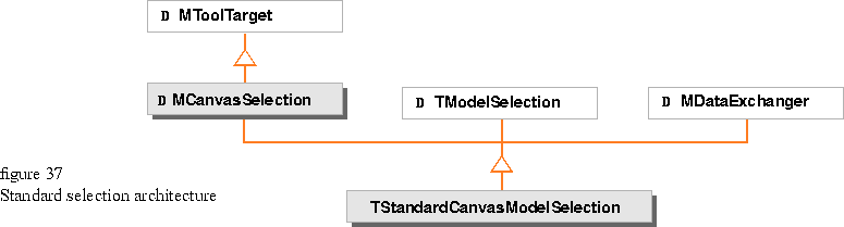 , TStandardCanvasModel derives from MCanvasSelection and TModelSelection. Mixing MCanvasSelection with TModelSelection allows TStandardCanvasSelection to select data in a model. Mixing in MDataExchanger provides clipboard support for cut, copy, and paste operations without your having to write code to implement those operations.