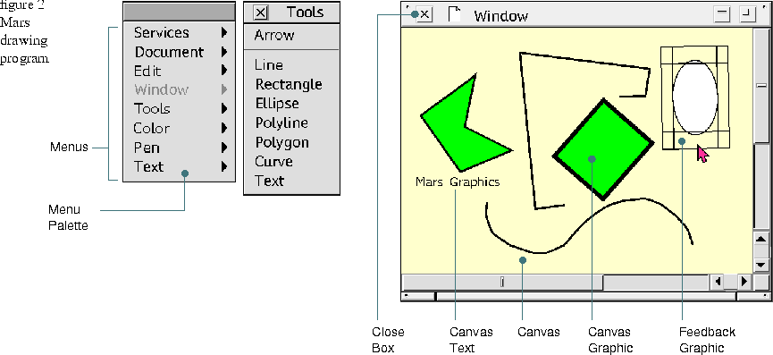 You use the graphic creation tools from the Tool menu to draw graphics onto a drawing surface called a canvas. The Arrow tool lets you select and manipulate the canvas graphics or create text. The Color and Pen menus let you apply color and line width to the selected graphics. The Text menu lets you select, edit, and manipulate text as you create it with the Text tool.