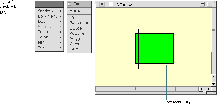 All selected canvas graphics display a feedback graphic appropriate to their geometry. Figure 8 shows a selected rectangle. Once you select a canvas graphic, you can choose a color from the Color menu or a pen width from the Pen menu to modify the appearance of the canvas graphic. Deselect all selected canvas graphics by clicking on an empty part of the canvas or by shift-clicking on a selected graphic.