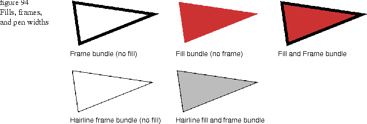 1 TFrameBundle frameBundle( TRGBColor( 0,0,0 ), 5.0 ); 2 TFillBundle fillBundle( TRGBColor( .75,.25,.25 ) ); 3 TFillAndFrameBundle fillFrameBundle( TRGBColor( .75, .25, .25 ), 4 TRGBColor( 0, 0, 0 ), 5 5.0, TPen::kOutsetFrame ); 6 THairlineFrameBundle hairFrameBundle( TRGBColor( 0, 0, 0 ) ); 7 TFillAndHairlineFrameBundle hairFillFrameBundle(TRGBColor( .75, .75, .75 ), 8 TRGBColor( 0, 0, 0 ) );