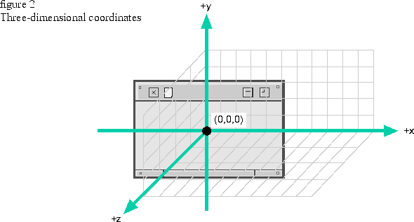 By default and as shown inFigure 2, positive world-coordinate units along the xaxis lie to the right of the origin; positive world-coordinate units along the yaxis lie above the origin; positive world-coordinate units along the z-axis lie out from the origin towards the viewer. The grid lines represent where points in world-coordinate units lie. For example, the point (9, 0, 3) is nine grid lines in the positive x direction, 0 lines in the positive y direction, and three lines in the positive z direction. The pixels are positioned in the spaces between the grid lines in the x-y plane. If you have, for example, a monitor that is 72 dpi, there is one pixel within each space, and if the monitor is 144 dpi, there are two pixels within each space.