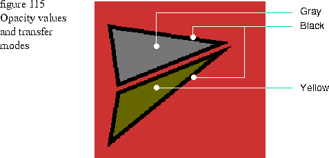 Copyright © Taligent, Inc. 1995 1 TColorPaint* whiteFrame = new TColorPaint( TRGBColor( GIntensity(1), GIntensity(1), 2 GIntensity( 1) ) ); 3 TColorPaint* blueFill = new TColorPaint( TRGBColor( GIntensity(0), GIntensity(0), 4 GIntensity(1), GIntensity(1) ) ); 5 TGrafBundle* polyBundle = new TGrafBundle( blueFill, whiteFrame, 6 TAttributeState::kFillAndFrame ); 7 TSolidPen* centerFramePen = new TSolidPen( 5.0 ); 8 polyBundle->AdoptFramePen( centerFramePen ); 9 10 TColorPaint* whiteFrame2 = new TColorPaint( TRGBColor( GIntensity(1), GIntensity(1), 11 GIntensity( 1), GIntensity(.5) ) ); 12 TColorPaint* blueFill2 = new TColorPaint( TRGBColor( GIntensity(0), GIntensity(0), 13 GIntensity(1), GIntensity( .5 ) ) ); 14 TGrafBundle* polyBundle2 = new TGrafBundle( blueFill2, whiteFrame2, 15 TAttributeState::kFillAndFrame ); 16 TSolidPen* centerFramePen2 = new TSolidPen( 5.0 ); 17 polyBundle2->AdoptFramePen( centerFramePen2 ); 18 19 TColorPaint* redFillColor = new TColorPaint( TRGBColor( GIntensity(.75), GIntensity(.25), GIntensity(.25), GIntensity( 1 ) ) ); 20 TGrafBundle redBundle( redFillColor, TAttributeState::kFill ); 21 22 TGrayInvertSrcTransferMode* frameTransferMode = new TGrayInvertSrcTransferMode(); 23 TGrayInvertSrcTransferMode* fillTransferMode = new TGrayInvertSrcTransferMode(); 24 polyBundle->AdoptFrameTransferMode( frameTransferMode ); 25 polyBundle->AdoptFillTransferMode( fillTransferMode ); 26 27 TSrcCopyTransferMode* frameTransferMode2 = new TSrcCopyTransferMode(); 28 TSrcCopyTransferMode* fillTransferMode2 = new TSrcCopyTransferMode(); 29 polyBundle2->AdoptFrameTransferMode( frameTransferMode2 ); 30 polyBundle2->AdoptFillTransferMode( fillTransferMode2 ); 31 TGPolygon aPolygonGeometry; 32 aPolygonGeometry.Append( TGPoint( 15, 30 ) ); 33 aPolygonGeometry.Append( TGPoint( 25, 100 ) ); 34 aPolygonGeometry.Append( TGPoint( 150, 50 ) ); 35 TPolygon* aPolygon = new TPolygon( aPolygonGeometry, polyBundle ); 36 37 TGPolygon aPolygonGeometry2; 38 aPolygonGeometry2.Append( TGPoint( 15, 170 ) ); 39 aPolygonGeometry2.Append( TGPoint( 25, 110 ) ); 40 aPolygonGeometry2.Append( TGPoint( 150, 60 ) ); 41 TPolygon* aPolygon2 = new TPolygon( aPolygonGeometry2, polyBundle2 ); 42 43 TA8R8G8B8Image anRGBImage( TGPoint::kOrigin, 200, 200 ); 44 TGrafPort* imagePort = anRGBImage.GetGrafPort(); 45 imagePort->Draw( TGRect( 0, 0, 200, 200 ), redBundle ); 46 47 aPolygon->Draw( *imagePort ); 48 aPolygon2->Draw( *imagePort ); 49 50 anRGBImage.Draw( thePort );
