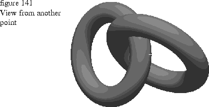 1 void DrawContents( TGrafPort& thePort ) const 2 { 3 TPerspectiveCamera* camera = new TPerspectiveCamera(); 4 camera->SetPosition( TGPoint3D( -200, 200,1440 ) ); 5 6 TSceneBundle* sceneBundle = new TSceneBundle(); 7 sceneBundle->AdoptCamera( camera ); 8 sceneBundle->SetAmbientLight( TRGBColor( 1, 1, 1 ) ); 9 TParallelLight* light = new TParallelLight( TGPoint3D(-1,-1,-1), TRGBColor(1,1,1,)); 10 sceneBundle->AdoptLight( light ); 11 TLinkedScenePort port( &thePort, sceneBundle ); 12 13 TTorus3D torus( 100, 25); 14 torus.Draw( port ); 15 torus.TranslateBy( TGPoint3D( 150, 0, 0 ) ); 16 torus.RotateBy( 50, TGrafMatrix3D::kAboutXAxis ); 17 torus.Draw( port ); 18 }