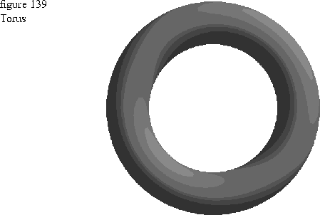 The sweep classes let you create shapes such as spheres, cones, tori, and cylinders in a few lines of code. Figure 139 shows the torus created from the DrawContents implementation that follows. The torus has a large radius of 100 worldcoordinate units, and a small radius of 50 world-coordinate units. The large radius is the distance form the origin (which is the center of the torus) to the inner edge of the torus, and the small radius is the distance from the inner edge of the torus to the center of the tube.