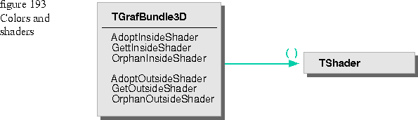 The shader computes the effects of illumination upon visible (front facing) surfaces. When a graphic is rendered, the adopted shaders are combined with the TSceneBundle information (light, atmosphere, and camera) to compute the final appearance of the inside and outside surface colors for drawing. The TGrafBundle3D functions for shaders are shown in Figure 193.