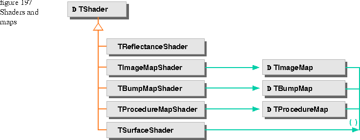 TImageMapShader is used with TImageTextureMap make a solid surface color modification. The TImageMap class is used with shaders that interpret the contents of a map as a solid surface color modification. The texture created by a TImageMap instance is applied to a surface in much the same way that wallpaper is applied to a wall. The value extracted from TImageMap can be used for a direct color substitution, as an index to another color map, or as a multiplier. Figure 198 shows the image map class architecture.