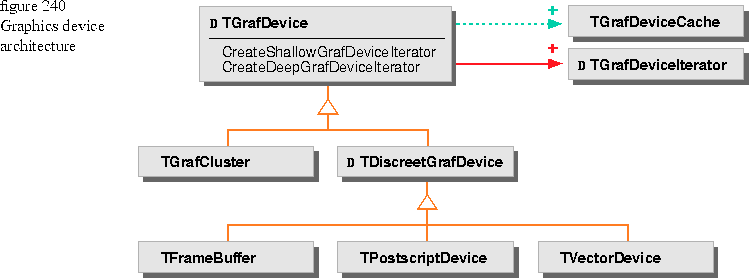 TGrafDevice is an abstract base class that provides graphical imaging services. The complete data set for any imaging call is fully specified in the graphic state, which gets passed to the TGrafDevice during the drawing operation. The graphic state and drawing operation were covered earlier in this chapter. Figure 240 shows the class architecture for graphics devices.