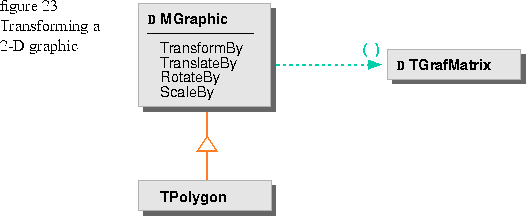 Transformation is the process of altering every point in a graphic to resize (scale), reorient (rotate), or move (translate) the graphic. MGraphic has the transformation functions shown in Figure 23. TranslateBy, RotateBy, and ScaleBy let you transform a 2-D graphic without using a matrix. You supply the values, and their default implementations create a temporary matrix and call the TransformBy function, which takes an instance of TGrafMatrix as a parameter. Transformations change the points of the 2-D geometry directly (except in the case of TEllipse) without copying the original points.
