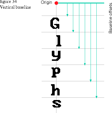 The x offset represents the baseline axis. As shown in Figure 32, each glyph is positioned at its offset location so that the glyph sits correctly on the baseline regardless of how far above or below the line it goes.