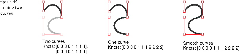 You can join two adjoining curves and then smooth out the join between them. The knot vectors provide a straightforward mechanism for doing this. For example, you might have two pinned uniform cubic curves with knot vectors starting at zero that meet at a common point. Follow the steps outlined below and shown in Figure 44 to join the curves. The curves being joined are both order four (k=4) curves.