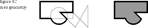 The shape is created by starting with an initial geometry and then adding to, subtracting from, intersecting with, or performing an exclusiveor operation on that initial geometry until the desired shape is created. An area geometry constructed from a rectangle, ellipse, and polygon is shown in Figure 62. The final area is outlined by the heavier line. When the graphic is filled and framed, only the portions delineated by the heavy outline are filled and framed.