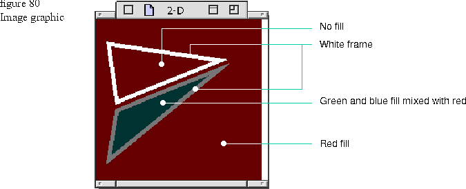 shows how the example looks at run time. The labels shows what happens to colors when opacity values are used. The opacity value determines how the source color is mapped to the destination color when pixels are drawn over each other. In Figure 80, a white frame is drawn over a red background at 0 opacity in the top polygon; and a white frame is drawn over a red background at 0.5 opacity in the bottom polygon. At 0.5 opacity value, the white frame blends with the red background and makes a shade of gray that looks purple. The bottom polygon also blends a green and blue fill at 0.5 opacity with the red background to make a dark purple shade for the polygon fill.