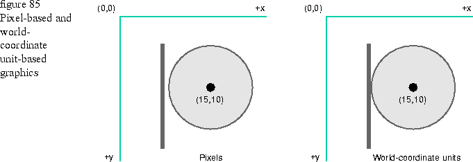 If you have a circle with a line tangent, for example, the line is not really against the circle in pixels. In world-coordinate units, the line is flush against the circle. Use regular graphics if it is important for the line to be flush against the circle. Figure 85 illustrates this point.